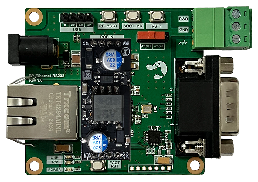 PP-Ethernet-RS232는 작지만 강력한 성능을 제공하는 이더넷-시리얼(RS-232) 변환 모듈입니다. WIZnet의 고성능 이더넷 변환 칩셋인 W55RP20이 탑재되어 있어 안정적이고 빠른 통신을 지원합니다. 이 모듈은 프로토콜 변환기로 동작하여, 시리얼 장치로부터 전송된 데이터를 TCP/IP 네트워크 데이터로 변환하고, 네트워크를 통해 수신한 TCP/IP 데이터를 다시 시리얼 장치가 이해할 수 있는 형식으로 변환합니다. 또한, 간단한 핀 설정만으로 모듈 제어가 가능하며, 강력한 펌웨어가 기본 탑재되어 있어 설치 후 IP 설정만 완료하면 즉시 사용 가능합니다. 복잡한 별도 설정 없이 바로 적용할 수 있어 편리합니다.